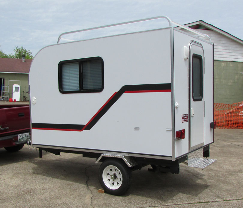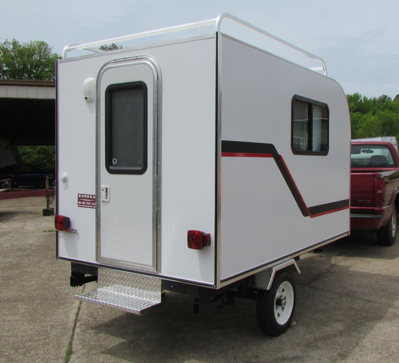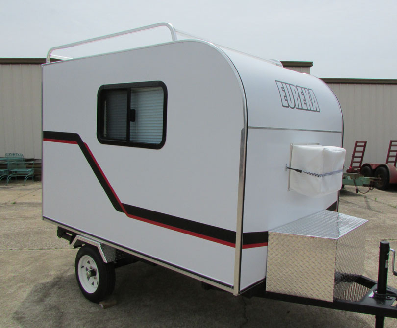 Our EUREKA Super Sport II 5x8 Camper sleeps two or more. It is constructed of aluminum so there's no wood or plywood for the weather to damage. With a width of 58 inches, and 58 inches of headroom, the Sport 5x8 weighs in at only 560 lbs., making it very easily towed by most vehicles. The foam insulation, along with screened windows and doors, allows for year-round camping comfort. Options for the Super Sport II 5x8 include a comfortable queen 6" mattress, canvas child's bunk, tongue storage locker and roof gear rack for your canoes, kayaks, bicycles, surfboards, etc., carry-on water system with sink, 2-burner exterior mount propane stove, and air conditioner. This Super Sport II is roomy, affordable and perfect for your outdoor sporting getaways!